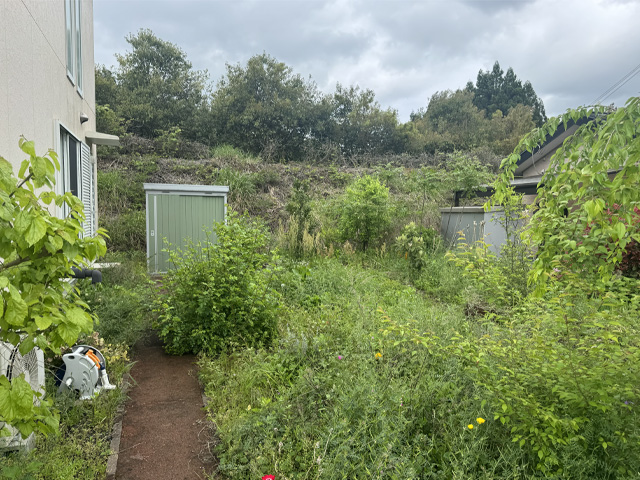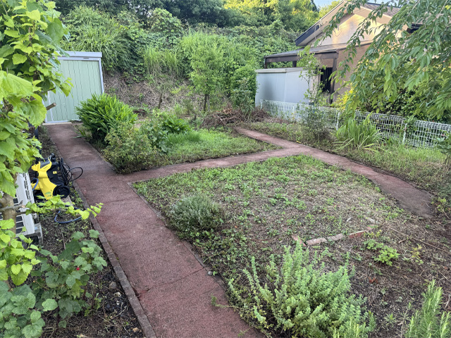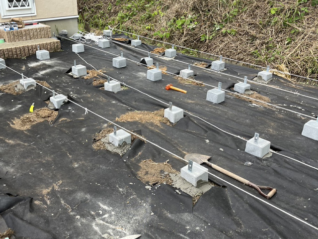 更に草刈りをしてプレートライナーで地均し後に防草シートを敷き詰めてから基礎を作りました。