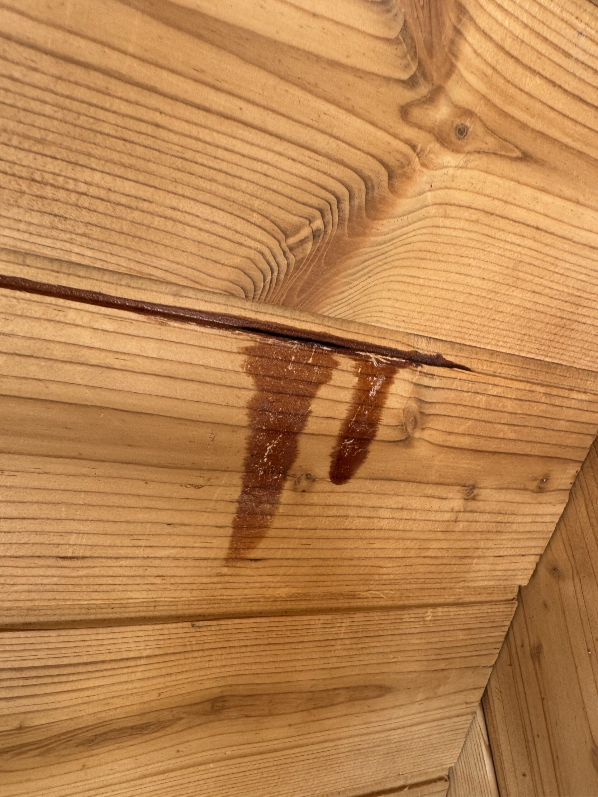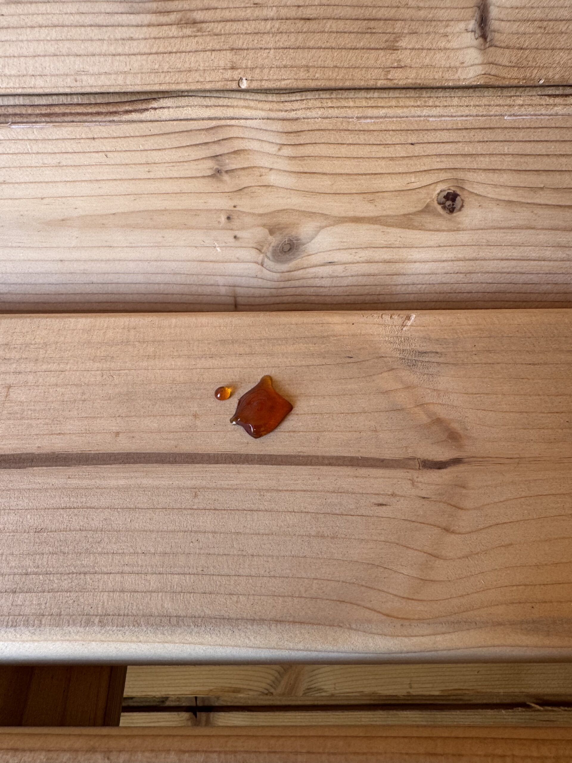 一方、丹波ヒノキサウナの方は撥水セラミック塗装を3回塗っていますので、ご覧の通り塗装により少し赤身がかっただけです。